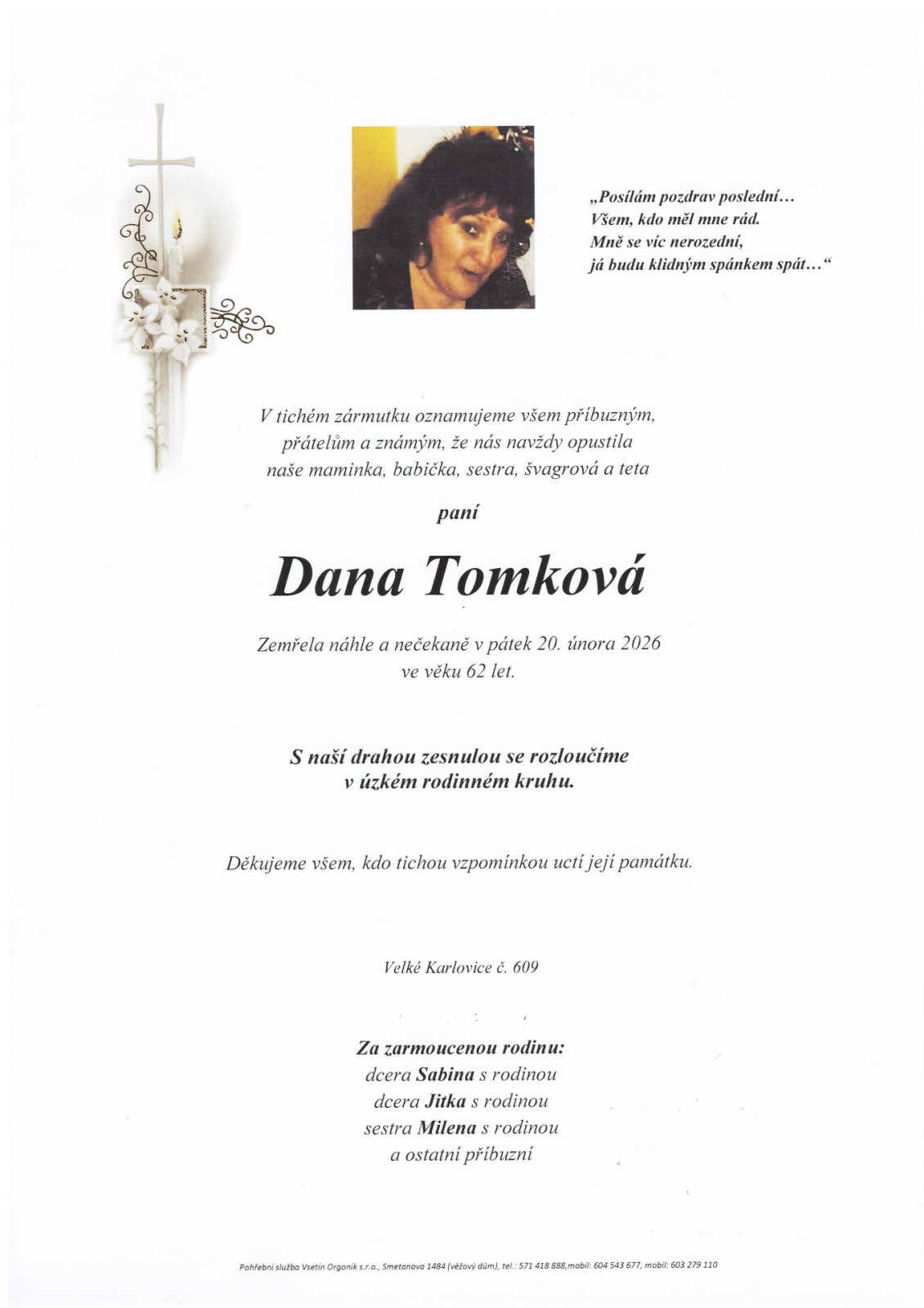 Květiny a smuteční vazbu zajišťujeme dle spádové oblasti ve třech květinářstvích - ve Vsetíně, Velkých Karlovicích a Halenkově.